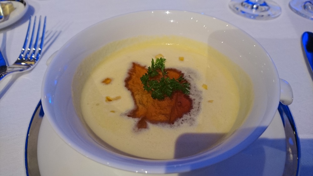 スイートコーンの冷製クリームスープ コンソメジュレ